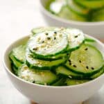 A refreshing and quick Japanese cucumber salad called Sunomono, featuring thinly sliced cucumbers dressed in a tangy rice vinegar and soy sauce dressing with a hint of sweetness and toasted sesame seeds.
