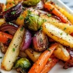 These 3 irresistible Christmas vegetable side dishes combine roasted carrots, parsnips, Brussels sprouts, and red onions, seasoned with thyme and olive oil, to create a tender, golden, and flavorful complement to any holiday meal. Drizzled with optional honey for a perfect balance of savory and sweet, this easy roasted vegetable medley is guaranteed to steal the show at your festive table.