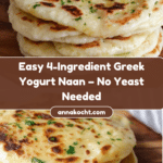 This easy 4 Ingredient Greek Yogurt Naan recipe is a quick and delicious no-yeast flatbread perfect for weeknight meals. Made with simple pantry staples—flour, baking powder, salt, and creamy Greek yogurt—this naan is soft, fluffy, and ready in under 20 minutes using a skillet stovetop method. Ideal for serving alongside curries, dips, or as a wrap, this no-yeast naan is perfect when you want homemade bread without the hassle of rising time.
