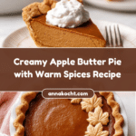 This Apple Butter Pie features a spiced, creamy filling made with apple butter, cinnamon, nutmeg, and cloves, baked in a flaky spelt pie crust. The pie is blind-baked before filling, then baked until just set and chilled to perfection, offering a rich and flavorful dessert perfect for fall and holiday gatherings.