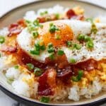 This quick and easy Breakfast Fried Rice recipe combines crispy bacon, fluffy scrambled eggs, and flavorful green onions with cooked rice for a satisfying morning meal. It’s a versatile dish that’s perfect for using up leftover rice and can be customized with your favorite hot sauce for an extra kick.