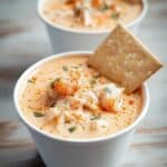 Two white cups filled with creamy, light orange soup that has visible chunks of white and orange seafood pieces mixed in. Each cup is topped with a single large, flat cracker sticking out from the side, and the surface of the soup is lightly sprinkled with orange seasoning. The background is a white marbled texture, and the focus is on the front cup while the second cup is softly blurred in the back. photo taken with an iphone --ar 4:5 --v 7