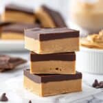 A stack of three thick square layers sits centered on a white marbled surface; each layer shows a pale tan, smooth peanut butter middle with a thick, dark chocolate top and a thinner dark chocolate bottom, creating a clean, even contrast. The peanut butter layers have a slightly crumbly texture with small air holes visible, while the chocolate layers are glossy and firm. Around the stack, a few chocolate chips lay scattered on the white marbled surface. In the blurred background, more squares of the treat are arranged on a white plate, and a white bowl filled with peanut butter is partially visible. The overall scene is bright with soft lighting highlighting the smooth and creamy textures. Photo taken with an iphone --ar 4:5 --v 7