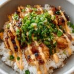 - Assemble the bowls: Top the warm rice with sliced crispy Cajun chicken. Drizzle the spicy mayo over the chicken and sprinkle sliced green onions on top for freshness and crunch.