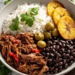 It’s traditionally served with white rice, black beans, fried plantains, or a simple green salad to balance the rich flavors.