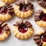 The image showcases an assortment of round, shortbread-style cookies with a red jam center, some of which are half-dipped and drizzled with milk chocolate. The cookies have a delicate, scalloped edge and the glossy jam contrasts beautifully with the smooth chocolate coating. The light background enhances the warm tones of the cookies, making them look appetizing and perfect for a sweet snack or dessert. photo taken with an iPhone --ar 4:5 --v 7