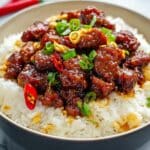 5. Garnish and Serve: Transfer the coated chicken to a serving dish. Garnish with sliced green onions, toasted sesame seeds, and optional thin strips of fried onion or bell pepper for extra crunch. Serve hot immediately with steamed rice, noodles, or lettuce cups.