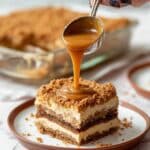 A square piece of layered dessert sits on a white plate with a brown rim, placed on a white marbled surface. The dessert has about four visible layers: the bottom and middle layers are dark brown and moist, likely cake or cookie layers, separated by creamy light brown layers. The top is covered with a thick layer of crumbly golden brown topping. A woman's hand with dark and glittery nail polish is pouring a smooth, glossy caramel-colored sauce from a metal measuring cup onto the center of the dessert. In the background, there is a clear glass baking dish filled with the same dessert, also topped with the crumbly golden layer, slightly out of focus. photo taken with an iphone --ar 4:5 --v 7