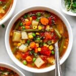 A hearty and healthy easy vegetable soup packed with fresh vegetables and comforting flavors. This simple stovetop soup features a medley of sautéed aromatics, potatoes, green beans, tomatoes, and frozen peas and corn, simmered to perfection in a flavorful vegetable broth with Italian seasoning for a warm, nourishing meal that’s perfect year-round.