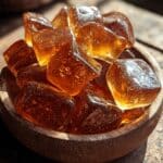 A rustic wooden bowl filled to the top with shiny amber brown candy pieces that have a smooth, glossy surface and look slightly translucent with tiny bubbles inside. The candy is piled high in an uneven mound, showing different shapes like rounded rectangles and squares, each catching the light with sparkling reflections and warm golden highlights. The bowl sits on a rough wooden surface with soft daylight creating deep shadows and a cozy mood. photo taken with an iphone --ar 4:5 --v 7