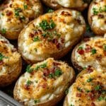 Diese gefüllten Kartoffeln nach Flammkuchen-Art sind ein herzhaftes Ofengericht mit Pfiff. Knusprige Kartoffelschalen werden mit einer cremigen Mischung aus Crème fraîche, Käse, Zwiebeln und Speck gefüllt und im Ofen goldbraun überbacken. Perfekt als Hauptgericht oder Beilage für gemütliche Abende.