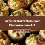 Gefüllte Kartoffeln nach Flammkuchen-Art sind ein herzhaftes Ofengericht mit besonderem Pfiff. Die Kombination aus cremiger Crème fraîche, würzigem Speck und aromatischem Käse macht dieses Rezept zu einem wahren Genuss. Ideal, um Gäste zu beeindrucken oder einen gemütlichen Abend zu Hause zu genießen.