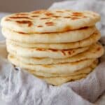 A stack of seven thick, soft flatbreads with a pale golden color is shown resting on a white and gray cloth that sits on a white marbled surface. Each flatbread has slightly uneven, rounded edges with light brown spots scattered mostly on the top layer, showing a toasted texture. The flatbreads are layered neatly on top of each other, creating a tall, fluffy pile with a bread-like texture that looks soft and fresh. Photo taken with an iphone --ar 4:5 --v 7