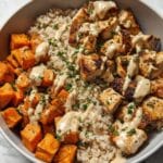 This Healthy Chicken & Sweet Potato Rice Bowl combines tender, seasoned chicken with roasted sweet potatoes and wholesome brown rice for a balanced and flavorful meal. Drizzled with a simple tahini sauce, it’s perfect for a nutritious lunch or dinner that’s easy to prepare.