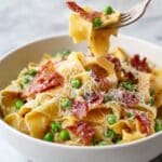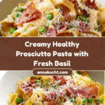 This Healthy Prosciutto Pasta dish offers a harmonious blend of tender pappardelle pasta and savory prosciutto crisped to perfection, tossed in a creamy sauce infused with garlic, fresh tomatoes, peas, and Italian seasoning. Finished with fresh basil and optional Parmesan cheese, it’s a delightful meal that balances rich flavors with fresh ingredients for a satisfying yet wholesome dinner.