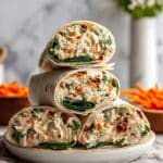 A close-up of four wraps stacked in a pyramid shape on a wooden plate, each wrap cut in half to show the filling inside. The wraps have a light beige, soft tortilla exterior with slight toasty spots. Inside, there is a creamy white layer mixed with small green herbs, orange carrot shreds, and bits of red sun-dried tomato, along with fresh green spinach leaves. The background is a soft-focus white marbled texture with a blurry white vase holding small white flowers. A small white bowl with shredded orange carrots sits near the plate on a light gray cloth. photo taken with an iphone --ar 4:5 --v 7