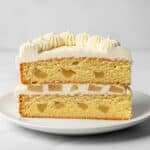 A slice of layered cake with two thick layers of golden-brown spongy cake filled with visible small chunks of light beige apples mixed in. Between the cake layers, there is a creamy white frosting layer, soft and smooth. The top layer of the cake is covered with a thick spread of the same white frosting, decorated with delicate swirls and peaks. The cake slice sits on a simple white plate, placed on a white marbled texture surface. Photo taken with an iphone --ar 4:5 --v 7
