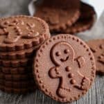 The image shows a close-up of a stack of round chocolate cookies embossed with a smiling gingerbread man design on a rustic wooden surface. The cookies have a scalloped edge and small perforations around the border, giving them a charming and festive appearance. One cookie is placed separately on the right, leaning against a white paper bag in the background, highlighting the detailed decoration on the cookies. The overall mood of the photo evokes a warm and cozy feeling, perfect for the holiday season. photo taken with an iPhone --ar 4:5 --v 7