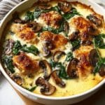 This Delicious Low-Carb Chicken Spinach Mushroom Bake is a creamy, savory dish perfect for easy weeknight dinners. Featuring tender chicken, earthy mushrooms, and fresh spinach in a rich Parmesan and cream sauce, baked to bubbly golden perfection. It’s a hearty, comforting meal low in carbohydrates and full of flavor.