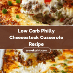 Keywords: Philly cheesesteak casserole, low carb casserole, ground beef casserole, keto cheesesteak, comfort food, baked cheesesteak