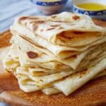 A stack of about eight folded flatbreads is placed on a round wooden board. The flatbreads are light beige with some parts showing darker brown spots from cooking, giving them a soft and slightly crispy look. The flatbreads are folded mostly in halves, arranged in a neat pile with the top flatbread folded twice. In the background, there are two small white bowls with blue decorations, containing a yellow liquid, placed on a white marbled surface. The image is bright and detailed, showing the soft texture of the flatbreads clearly. photo taken with an iphone --ar 4:5 --v 7