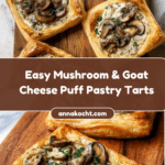 These Mushroom, Shallot, and Herbed Goat Cheese Tarts are delicate puff pastry squares filled with a savory mixture of sautéed mushrooms, shallots, garlic, fresh herbs, and creamy goat cheese, topped with a golden egg wash. Perfect as an elegant appetizer or light meal, these tarts deliver rich, comforting flavors with a beautiful flaky crust.