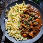- Schritt 7: Nach Belieben das Gulasch mit in Wasser aufgelöster Stärke andicken, um eine schön sämige Sauce zu erhalten.