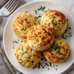 A stack of six golden brown biscuits sits on a white plate with a slightly raised edge, placed on a white marbled surface. Each biscuit is round with a rough, crumbly texture and a crispy, browned top showing uneven patches of melted cheese and finely chopped green parsley sprinkled across the surface and edges. The biscuits are arranged in a loose pile, with three on the bottom layer, two in the middle, and one balanced on top, revealing soft, fluffy interiors. In the background, a white mug is visible, softly blurred near a window with natural light brightening the scene. Photo taken with an iphone --ar 4:5 --v 7