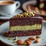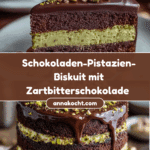 Eine köstliche Schokoladen-Pistazien-Torte mit zarter Zartbitterschokolade und knackigen Pistazienstücken, die perfekt für alle Schokoladenliebhaber und Nussfans ist.