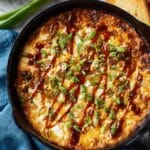- Bake the Dip: Transfer the mixture to a cast iron skillet or any oven-safe baking dish. Drizzle extra BBQ sauce on top and sprinkle additional cheddar and mozzarella cheese evenly over the dip. Place in the oven and bake for 20–25 minutes, or until the dip is bubbly and the cheese is melted and golden.
