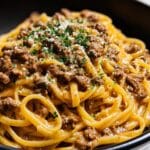 This one-pot creamy beef and garlic butter pasta is a comforting and hearty meal perfect for busy weeknights. Ground beef is cooked with garlic and seasonings before simmering in a rich broth and milk sauce with pasta. Finished with parmesan cheese and butter, this dish is creamy, flavorful, and easy to make using just one pot for minimal cleanup.