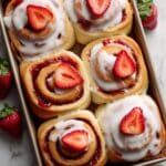 Delight in these decadent Strawberry Cheesecake Cinnabon Rolls, a perfect fusion of classic cinnamon rolls with creamy cheesecake filling and fresh strawberries on top. Soft, fluffy dough is layered with spiced cinnamon sugar and rich cheesecake, baked to golden perfection, and finished with a luscious cream cheese icing and a fresh strawberry topping. Ideal for a special breakfast or brunch treat.