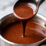 A close-up view of a shiny metal pot filled with smooth, thick, dark reddish-brown sauce, showing small black specks throughout. A black ladle lifts some of the sauce above the pot, with the sauce slowly dripping back. The pot sits on a white marbled textured surface. photo taken with an iphone --ar 4:5 --v 7
