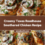 This Delicious Texas Roadhouse Smothered Chicken recipe features tender chicken breasts smothered in a savory mushroom and onion sauce, topped with melted Monterey Jack cheese. Searing the chicken locks in juices while the creamy sauce creates a rich, comforting dish reminiscent of classic Texas Roadhouse flavors, perfect for a cozy family dinner.