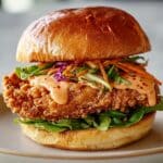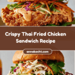 This Thai Fried Chicken Sandwich is a flavorful twist on a classic favorite, combining crispy, curry-marinated chicken with vibrant Thai-inspired toppings. A spicy chili mayo, fresh herbs, and pickled vegetables create a perfect harmony of textures and tastes in every bite.