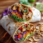 - Serve: Cut each wrap diagonally in half and serve with lime wedges and extra peanut sauce on the side for dipping. Enjoy the fresh, vibrant flavors of your Thai Peanut Chicken Wraps!