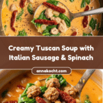 This hearty Tuscan Soup combines the rich flavors of Italian sausage, sun-dried tomatoes, and creamy spinach. Perfect for a cozy dinner, it’s a comforting dish that’s easy to prepare and full of vibrant tastes.