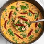 A hearty and flavorful Tuscan Soup featuring sun-dried tomatoes, Italian sausage, cannellini beans, and fresh baby spinach simmered in creamy chicken broth. Crisp bacon adds a savory crunch, making it a perfect cozy meal for any season.