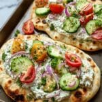 A fresh and flavorful Tzatziki Chicken Pizza combining the cool creaminess of tzatziki sauce with juicy chicken, crisp veggies, and tangy feta cheese on a crispy naan bread base. This quick and easy Mediterranean-inspired pizza is perfect for a delicious weeknight dinner or casual gathering.